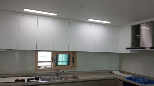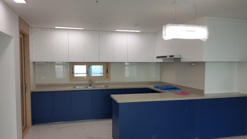 기존 오크 색상의 싱크대를 하부 네이비색 상부 화이트 색상으로 시공하엿습니다